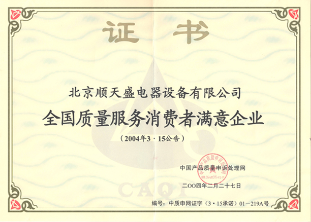 • 全國質(zhì)量服務(wù)消費者滿意企業(yè)證書